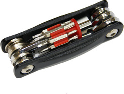 Többfunkciós csavarhúzó 20 különböző típusú szerszámmal. imbuszkulcsok 3; 4; 4,5; 5; 6, további bitek: torx T4, T5, T6, T7, T8, T9, T10, T15, lapos 1,5; 2; 2,5 mm, kereszt PH000, PH00, PH0. Hossza 88 mm, szélessége 32 mm, vastagsága 25 mm.