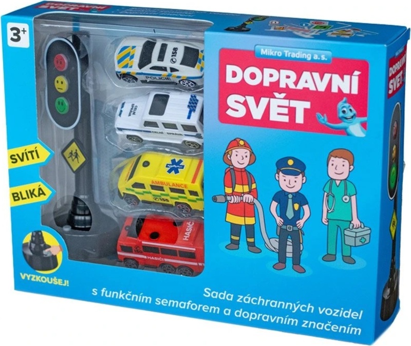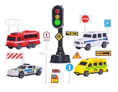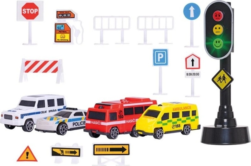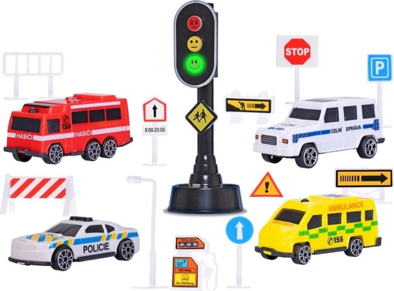 Négy autó készlet közlekedési táblákkal és fényhatásokkal rendelkező lámpával.