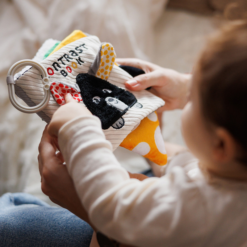 Kontrasztos színek: Ezt a magas kontrasztú könyvet a legkisebbek számára terveztük. A fekete-fehér kontrasztok és a piros és sárga akcentusok az első színek, amelyeket a babák észlelnek. Serkentik a látásukat az élet első hónapjaiban.