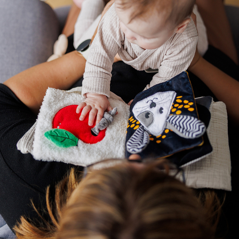 Rágóka: Ezt a textil baba könyvet rugalmas rágókával egészítettük ki. Masszírozza a fájó ínyeket, és további érzékszervi élményt nyújt. A gyermeked megkönnyebbülést érez a fogzás során.