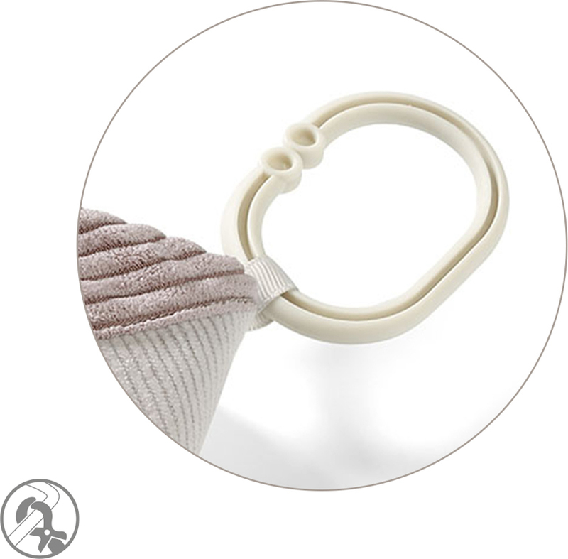 Praktikus fogantyú: A univerzális gyűrűnek köszönhetően a játékot fel lehet akasztani a babakocsira, kiságyra vagy autósülésre. Könnyen rögzíthető és eltávolítható. Ez a tökéletes társ a fejlődési játékokhoz otthon, séták során és utazáskor.