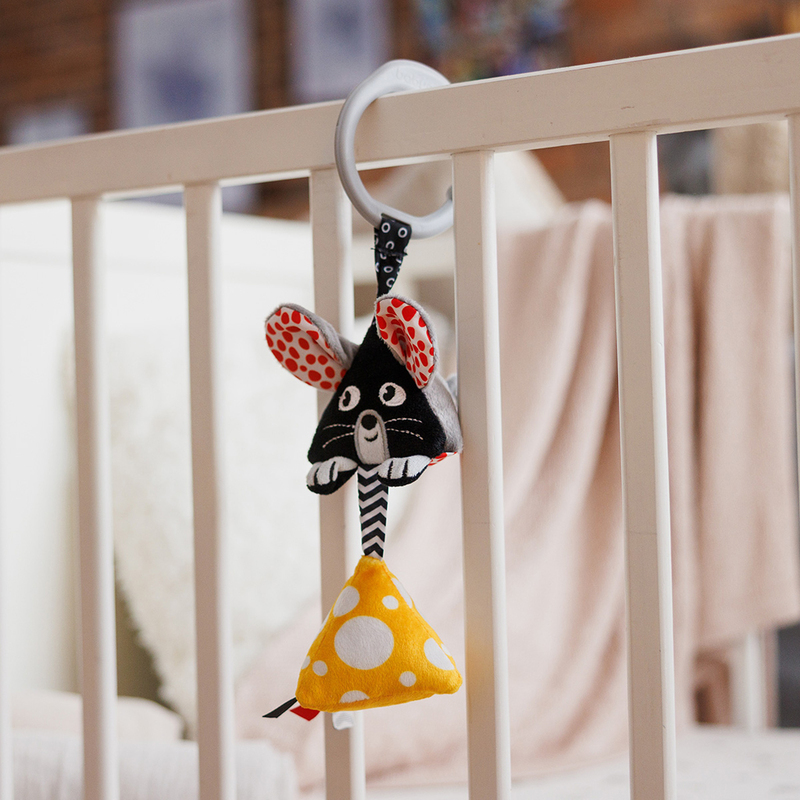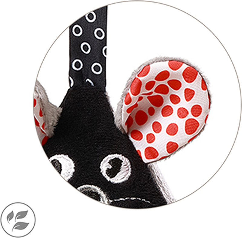 A felfüggeszthető kontrasztos játék egér formájában bevezeti gyermekét az első színek, hangok és textúrák világába. Rögzítse a kiságyra, babakocsira vagy autósülésre.