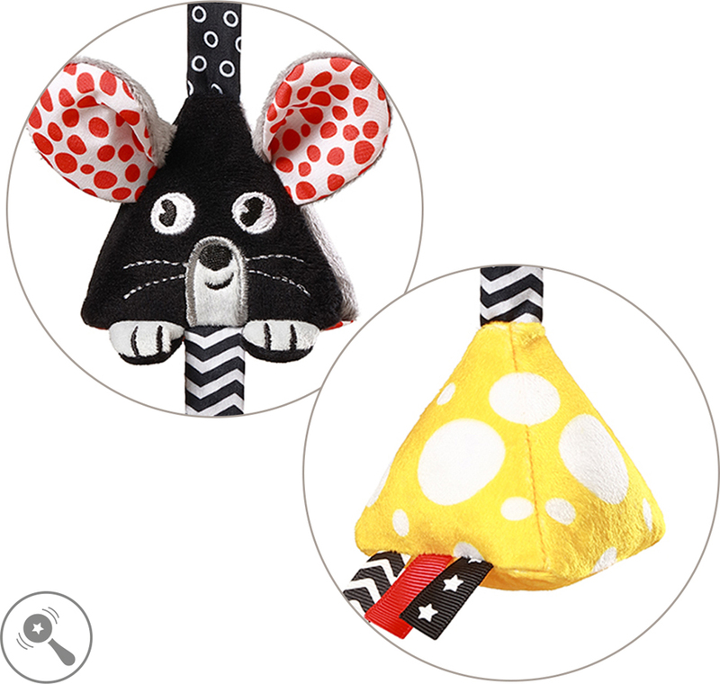 A zörgő sajt és egér, valamint a ropogós fülek stimulálják a hallást és megismertetik a gyermeket a különböző hangokkal. A színes címkék és a göndör farok támogatják a megfogást és az ujjak ügyességét.