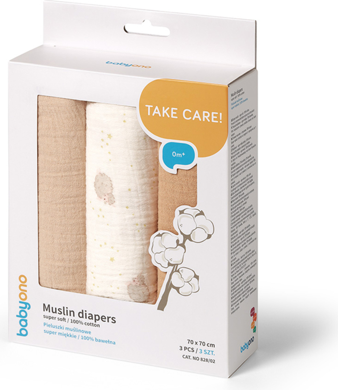 BABYONO Muszlin pelenkák Super Soft 3 db, Bézs 70 x 70 cm