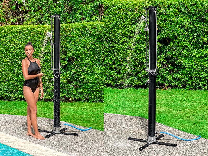 A Bestway® Solarflow™ kerti zuhany űrtartalma 20 liter, ideális és környezetbarát megoldást kínál a frissítő élményhez közvetlenül a kültéren. Az integrált tartályának köszönhetően kizárólag napenergia felhasználásával melegíti a vizet, így biztosítva a meleg vizet bármilyen további elektromos energiafogyasztás nélkül. A 218 cm impozáns magasságával funkcionális és stílusos kiegészítője lesz minden medencehelyszínnek, terasznak vagy kertnek.