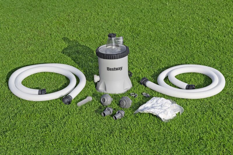 - A csomag tartalma: Szivattyú, szűrőgolyók, 2x 1,5 m tömlő, belépő és kilépő szűrő, adapterek