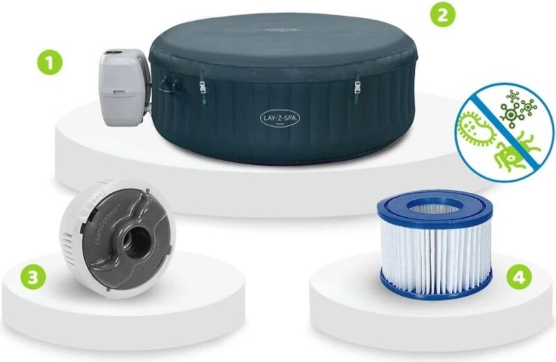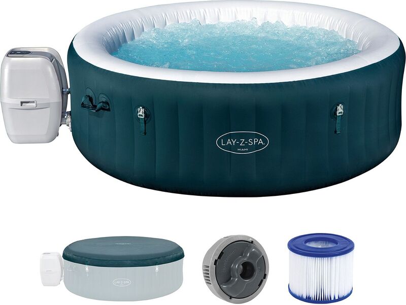 Az energiatakarékos Bestway® LAY-Z-SPA® Miami AirJet™ pezsgőfürdő 2 részes szigetelő takaróval, ChemConnect® kémiai adagolóval, 60311-es szűrőkartussal VI méret (10,6 x 8,0 cm) és két javító folttal érkezik.