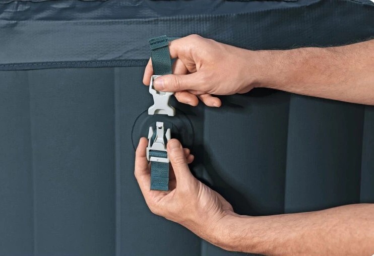 Nincs szükség szerszámra! A pezsgőfürdő könnyen összeszerelhető és szétszerelhető a szállító fogantyúknak és a pezsgőfürdő fűtőberendezésével történő felfújásnak köszönhetően. Az integrált leeresztő cső kerti tömlő adapterrel megkönnyíti a medence kiürítését.