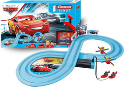Carrera FIRST autópálya 2,4 m hosszú Villám McQueennel és Jackson Stormmal a CARS című filmből, gyerekeknek 3 éves kortól, akkumulátoros, egyeneseket, kanyarokat, forgókapukat, vezérlőket és CARS témájú dekorációkat tartalmaz.