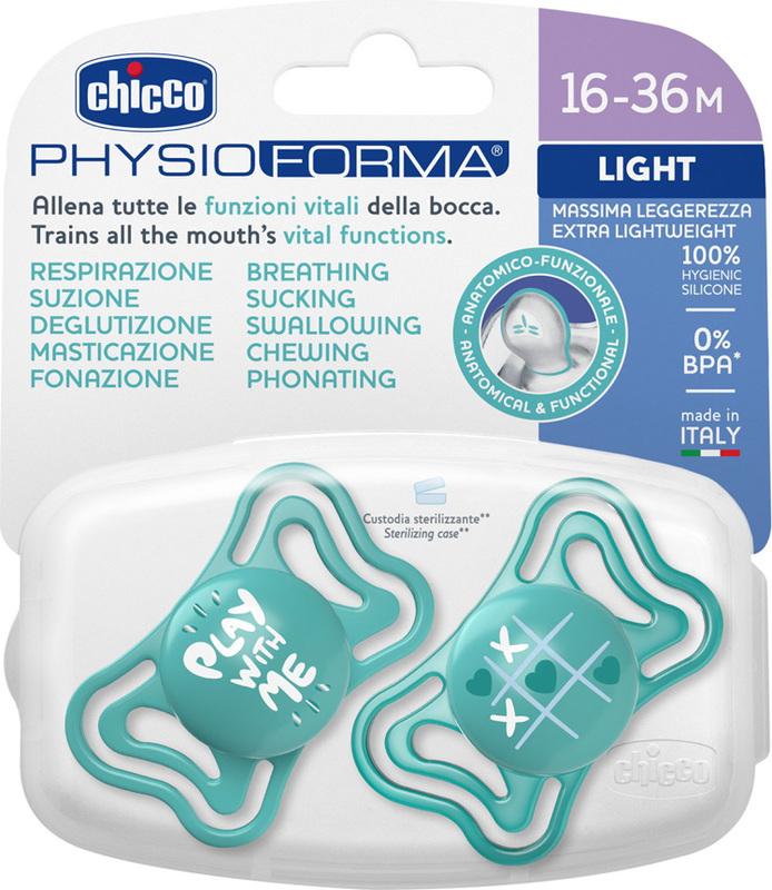 A Chicco Physio Light Physioforma cumi aktív ortodontikus megnyugtató cumi, amely könnyített, extra szellőző alapjával biztosítja, hogy a gyermek szinte észre se vegye, hogy valami van az arcán. A szellőzőnyílásokkal ellátott formázott pajzs a gyermek arcának kis kontúrjaihoz illeszkedik, és segít csökkenteni a nedvesség felhalmozódását a száj körül. Az extra puha cumi a nagyobb kényelem és a kisebb csúszás érdekében segít a gyermeknek a szopásban maradni. A cumi ergonomikus formája bizonyítottan támogatja az újszülöttek helyes fiziológiai légzését. Segíti a nyelv helyzetét a szájpadlás felé, tehát előre és felfelé, így tanítja a gyermeket, hogy már születésétől kezdve helyesen lélegezzen az orrán. Ezen kívül ez az anatómiai cumi támogatja a helyes állkapocs fejlődését. A helytelen szájlégzés, amelytől a Chicco Physioforma cumik ergonomikus formája megóvja a gyermekeket, ugyanis növeli a SIDS kockázatát, és hozzájárul a száj és az állkapocs helytelen fejlődéséhez. A cumik sterilizáló tokban vannak csomagolva, amelyet mindig magánál tarthat, és a tok segítségével a mikróban 3 perc alatt sterilizálhatja a cumikat. A Physio Light cumi kiváló folytatása a Chicco Micró cuminak, de bármilyen más 0-2 hónapos cumi után is használható.