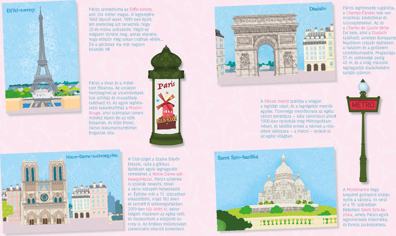A gyerekek a saját elképzeléseik alapján sokféle újrafelhasználható matricával egészíthetik ki az ismert párizsi helyszíneket.