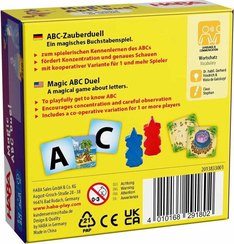 A Magic ABC Duel játékban minden a betűkről, a sebességről és egy kis varázslatról szól. A játékosok intelligensen próbálják kihasználni a kártyáikat szavak alkotásával vagy a szabályok szerint betűk kombinálásával. Minden kör izgalmas párbajt teremt, ahol a játékosoknak gyorsan kell reagálniuk és gondosan meg kell fontolniuk, melyik kártyát játsszák. Az egyszerű szabályoknak és a rövid köröknek köszönhetően a játék ideális a gyerekek számára, akik játékosan szeretnék gyakorolni a betűket és szavakat. Ugyanakkor a gyors tempó biztosítja, hogy ezt a kompakt kártyajátékot az idősebb játékosok is élvezhessék. A színes illusztrációk és a HABA jellegzetes stílusa pedig vonzóvá teszi a játékot az egész család számára.