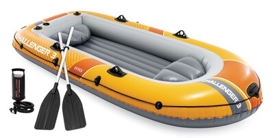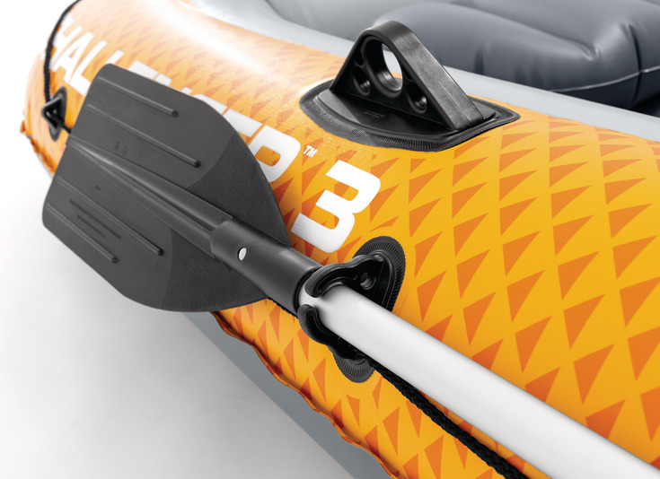 A Intex Challenger™ 3 felfújható csónak élénk narancssárga színben tökéletes társ a nyugodt tavak és folyók felfedezéséhez. Ez a robusztus csónak 3 fő számára készült, összesen 320 kg teherbírással. A SuperStrong™ PVC fejlett anyagának és a három független légkamrával rendelkező konstrukciónak köszönhetően magas szintű biztonságot és ellenállást biztosít a sérülésekkel szemben.