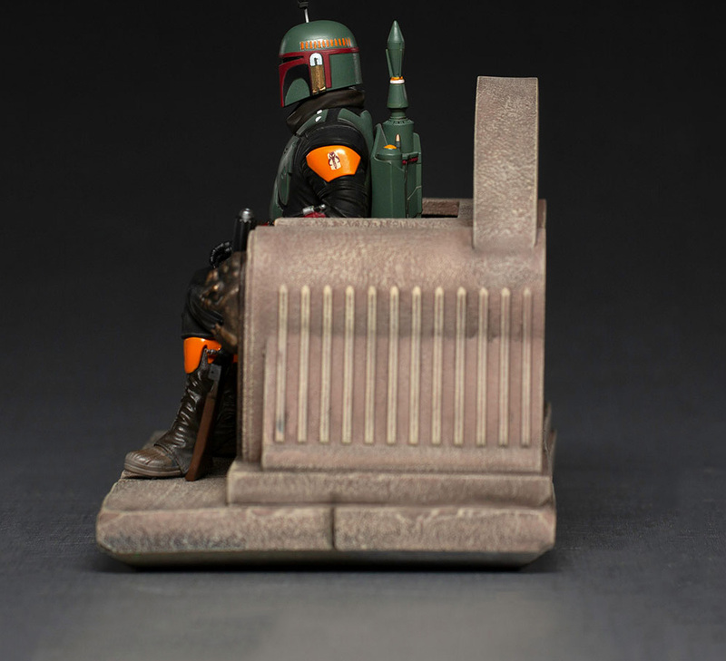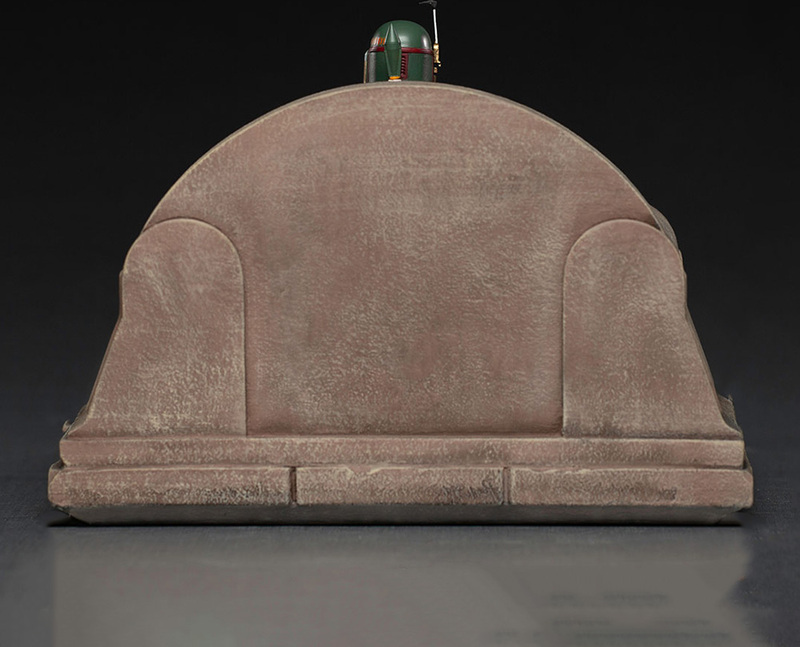 A szobor Boba Fettet ábrázolja, amint monstruózus bronzfejekkel díszített trónon ül – a sorozat jelenetének hű másolata, amelyet minden részletre kiterjedő figyelemmel dolgoztak ki. Az ikonikus zsoldos megjelenik megújított mandalori páncéljában, klasszikus blaster puskájával, amely a betontrón bal vállának támaszkodik.