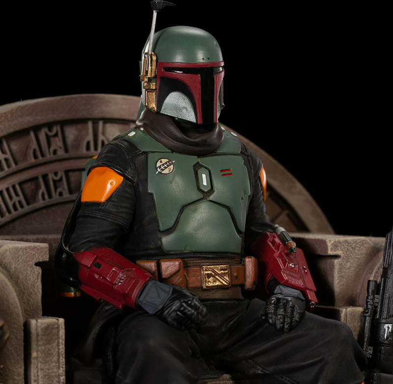 A „Boba Fett on Throne Deluxe – Art Scale 1/10" szobor az Iron Studios jóvoltából megörökíti a legendás fejvadászt, Boba Fettet az ikonikus jelenetben a The Mandalorian második évadából. A galaxis egyik legfélelmetesebb fejvadásza, aki a bűnözői alvilág és a Birodalom számára is dolgozott, évekkel később újra felbukkant – elfoglalta a trónt a meghalt Jabba után, és a galaxis új nagy gengszterfőnökévé vált.