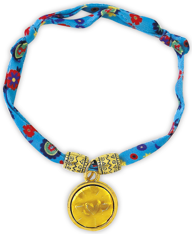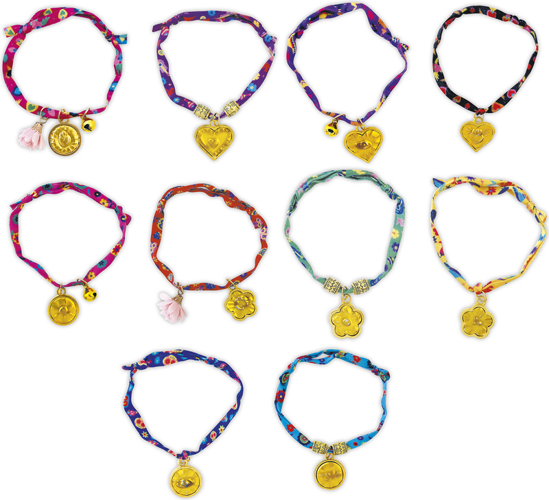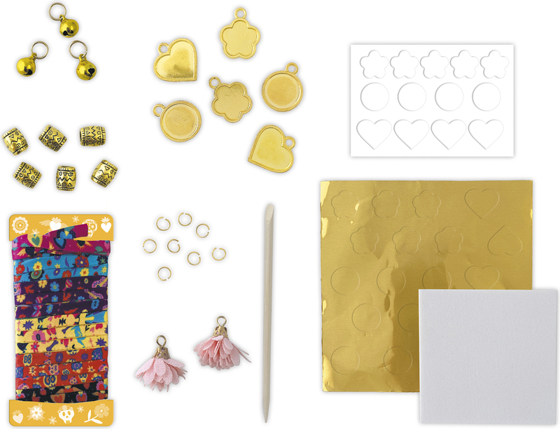 Virágosítsd meg az életed! Ez a kreatív készlet 10 virágmintás szalagból készült karkötő elkészítésére használható, amelyeket saját készítésű arany medálokkal díszíthetsz: dombornyomott fólia dekorációk, amelyek kabosonokra vannak ragasztva!Tartalmaz 6 arany csöves gyöngyöt, 2 virágos bojtot, 3 arany csengőt, 10 x 30 cm hosszú nyomtatott szalagot, 10 kabosont, 12 fülbevalót, 1 dombornyomó fólia lapot, 1 habszivacs alátétet a fólia elhelyezésére a dombornyomás során, 1 fa eszközt, kétoldalas matricalapot és 1 útmutatót és ötleteket tartalmazó brosúrát. Ez a tevékenység, amely segít a kreativitás fejlesztésében, összesen 3 óra 20 percet vesz igénybe (plusz-mínusz)!