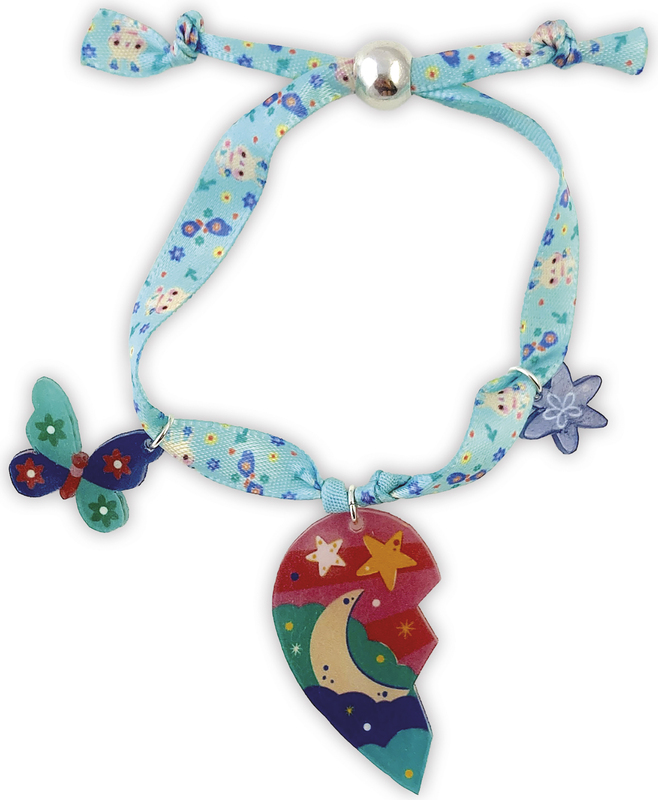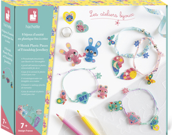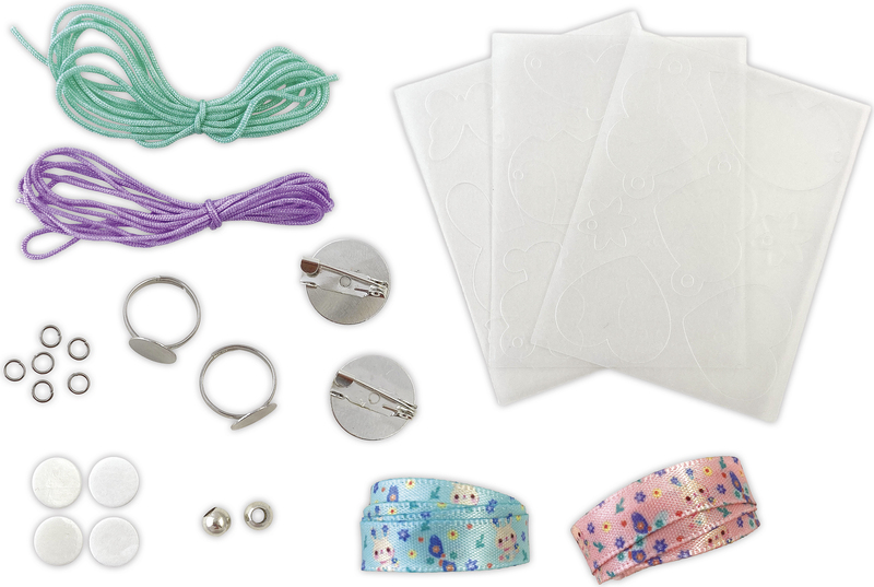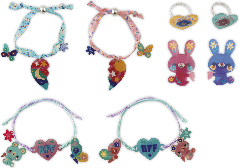 Készítsen ékszerpárokat varázslatos műanyagból, és ossza meg őket legjobb barátnőivel!Ezzel a kreatív készlettel 4 pár ékszert készíthet: 4 karkötőt (2 pár), 2 brosst (1 pár) és 2 gyűrűt (1 pár). Tartalmaz 3 előre vágott és perforált varázslatos műanyag lapot, 2 gyűrűalapot, 2 brosst alapot, 2 jáde fonalat, 2 nyomtatott szalagot, 12 összekötő gyűrűt, 4 kétoldalas ragasztó pöttyöt és 1 útmutatót mintákkal.