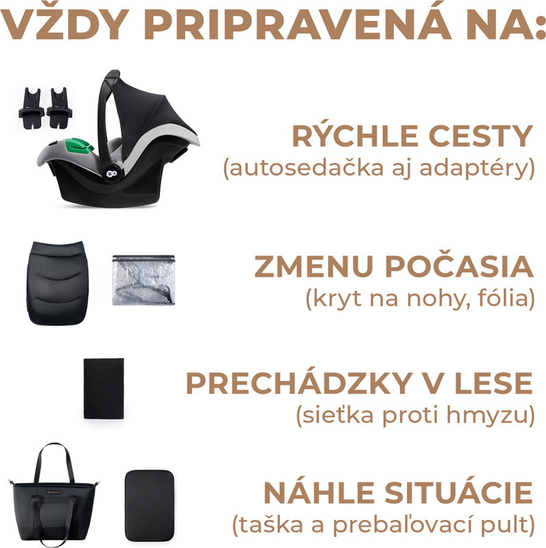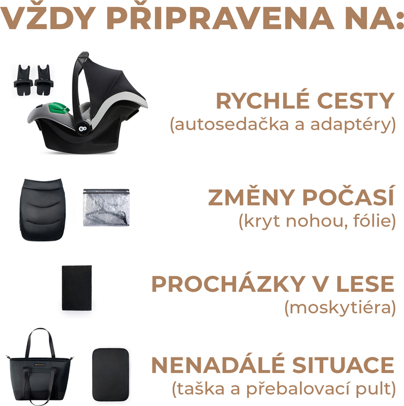 A kocsi praktikus kiegészítőkkel érkezik: elegáns táska utazó pelenkázó alátéttel, esővédő, rovarháló, gyermekülés adapterekkel, matrac a mózeskosárhoz, lábzsák (sportkocsihoz és mózeskosárhoz is).