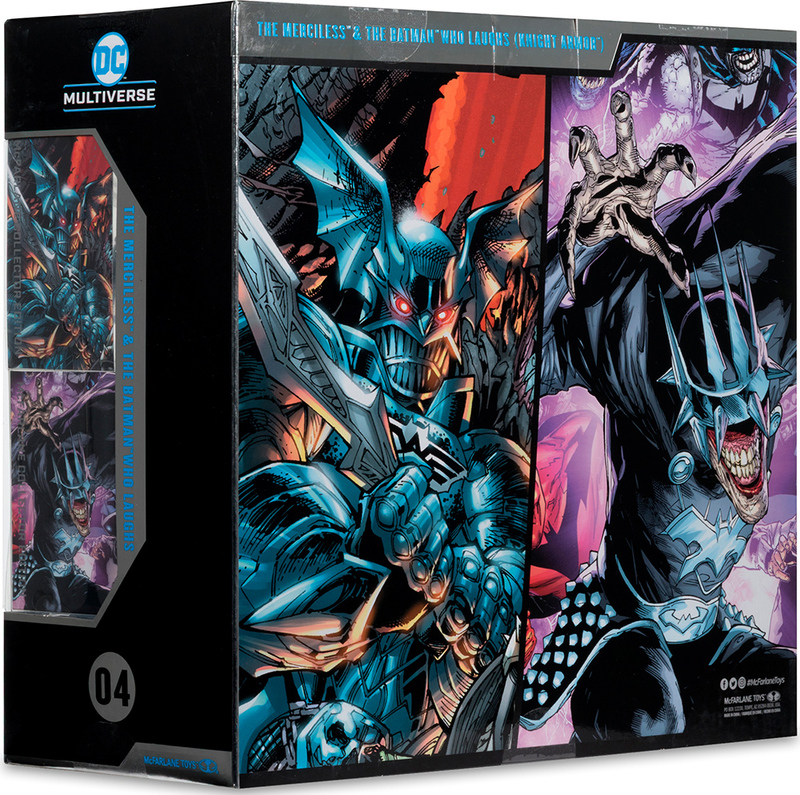 The Batman Who Laughs je stelesnením najhoršej nočnej mory Brucea Wayna – verzia Batmana infikovaná Jokerovým nanotoxínom, ktorá spája genialitu detektíva so šialenstvom jeho najväčšieho nepriateľa. The Merciless z Earth-12 je zasa nemilosrdnou fúziou Batmana a boha vojny Area. Odpútaný od svojich morálnych zásad, odetý v magickej zbroji a ozbrojený mečom God Killer, predstavuje nezastaviteľného vojnového štvaca.