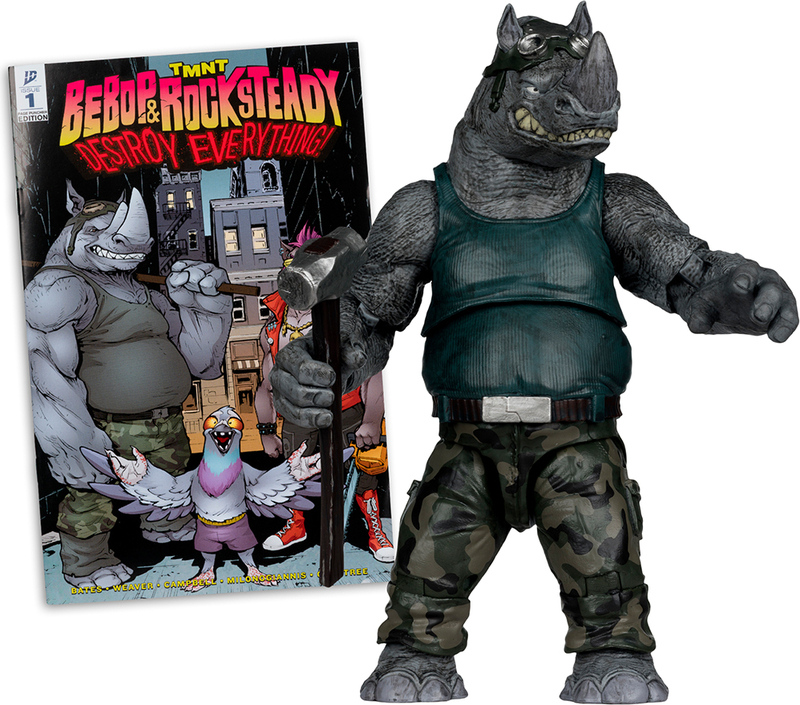 McFarlane Toys x Teenage Mutant Ninja Turtles Page Punchers – Rocksteady figura egy magasan mozgatható akciófigura 5 hüvelyk méretarányban, amely az IDW Publishing Teenage Mutant Ninja Turtles képregények művészi stílusa alapján készült.