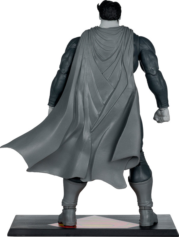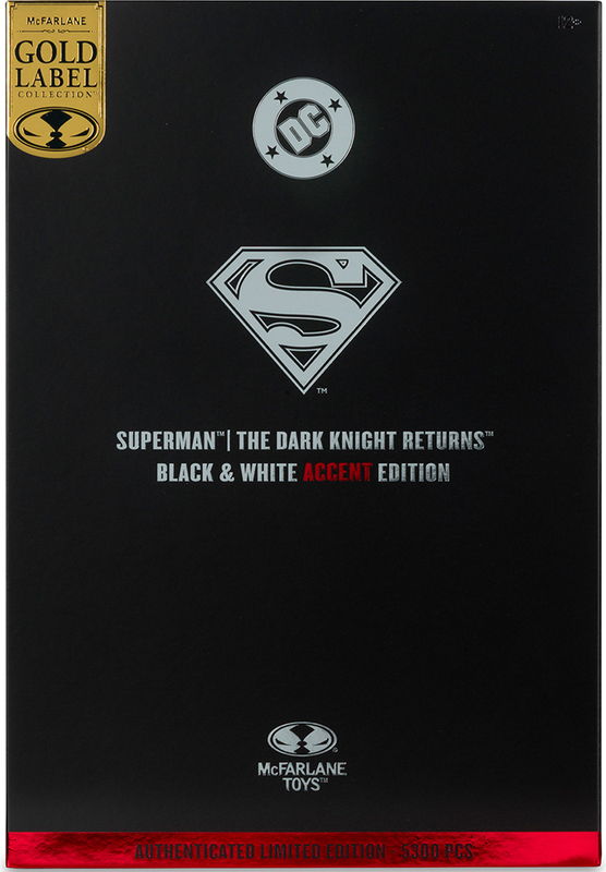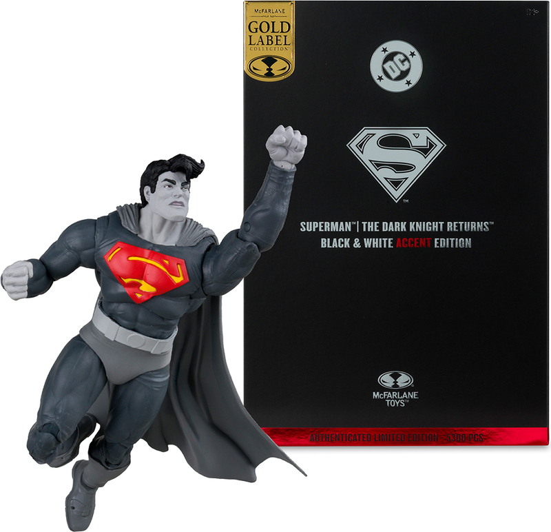 Superman (Sötét Lovag Visszatér) egy részletesen kidolgozott gyűjtői figura a DC Multiverse sorozatból, a McFarlane Toys jóvoltából. Kal-El – akit a haldokló Krypton bolygóról küldtek a Földre, és Martha és Jonathan Kent farmerek neveltek fel Clark néven – a sárga napfény hatására rendkívüli képességekre tett szert, beleértve a fölényes erőt, sebességet és repülést. A közeli jövőben az elnök megidézi őt, hogy megnyugtassa a helyzetet Gotham City-ben, és megállítsa Batman visszatérését a bűn ellen – ami két szuperhős epikus összecsapásához vezet a Föld sorsáért. A figura Superman-t ábrázolja egy exkluzív fekete-fehér öltözetben piros és sárga részletekkel.