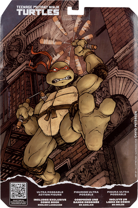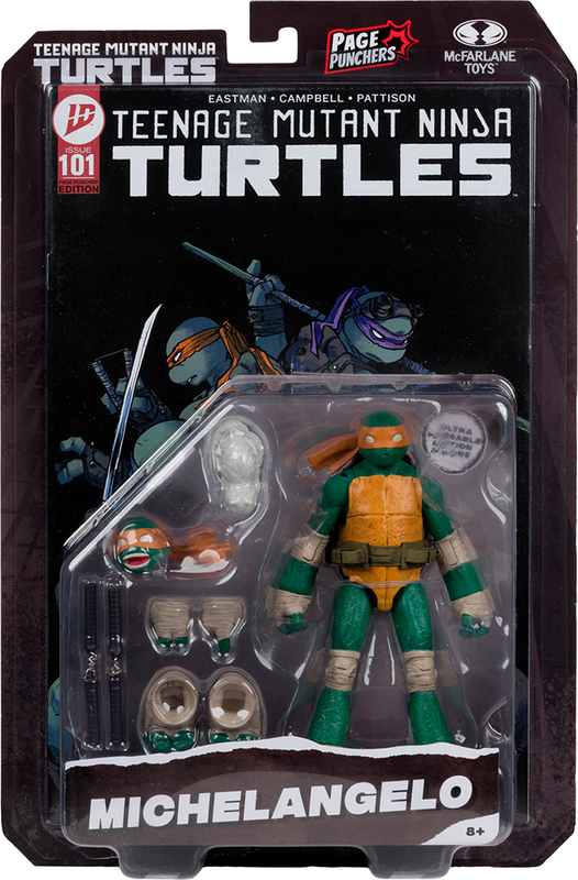 McFarlane Toys x Teenage Mutant Ninja Turtles Page Punchers – Michelangelo figura egy magasan mozgatható akciófigura 5 hüvelyk méretarányban, amely az IDW Publishing Teenage Mutant Ninja Turtles képregények művészi stílusa alapján készült.