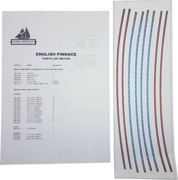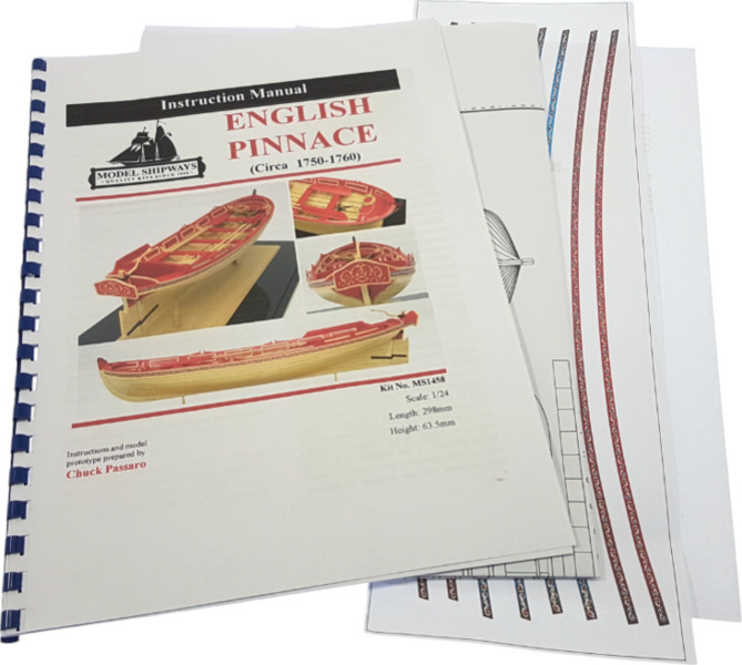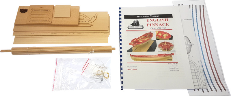 A Model Shipways English Pinnace 1:24 méretarányú statikus hajómodell építő készletének része a modell rajzkészlete, kézikönyv, lézervágott rétegelt lemez alkatrészek készlete, lécek, rézdrót, gyűrűk, kötél, horgony öntvény stb.