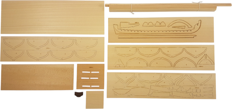 A doboz fedelének felnyitásakor fából készült, rétegelt lemezből készült modellalkatrészeket, lécek készletét, apró alkatrészeket zacskókban, rajzok készletét és kézikönyvet talál.