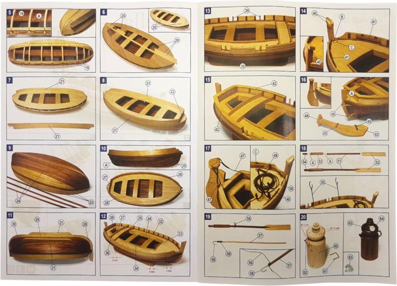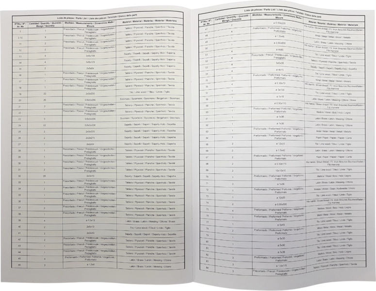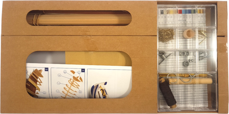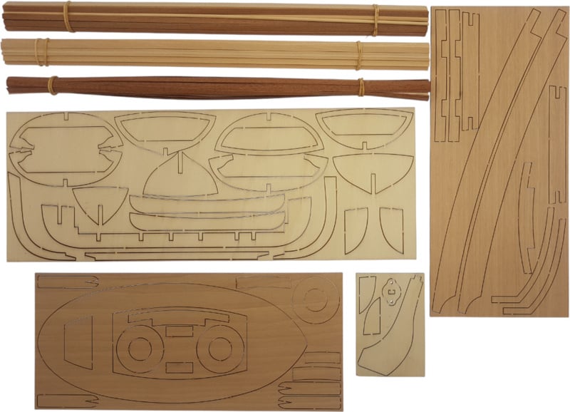 A csomag lézerrel vágott faalkatrészeket, deszkákat, megmunkált faalkatrészeket, fém öntvényeket, sárgaréz alkatrészeket, köteleket tartalmaz. Útmutató és építési rajzok.