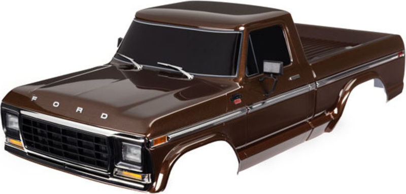 Traxxas karosszéria Ford F-150 1979 barna metál. Teljesen lefestett karosszéria, beleértve a hűtőrácsot, tükröket, ajtókilincseket, ablaktörlőket és szegecs nélküli rögzítési rendszert.