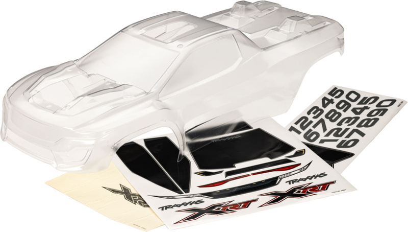 Traxxas XRT karosszéria átlátszó (festést igényel). Teljesen vágott, beleértve a rögzítő furatokat is. Védőfóliát tartalmaz. A csomag tartalmaz egy ablakmaszkot és egy matricalapot.