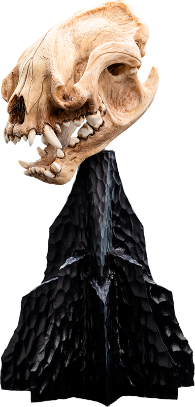 Warg Miniatúra Koponya – A Középfölde Gyűjteménye egy figyelemre méltó példány, amely felfedi ennek a lenyűgöző lénynek a ragadozó erejét és evolúciós alkalmazkodását a Középföldén.