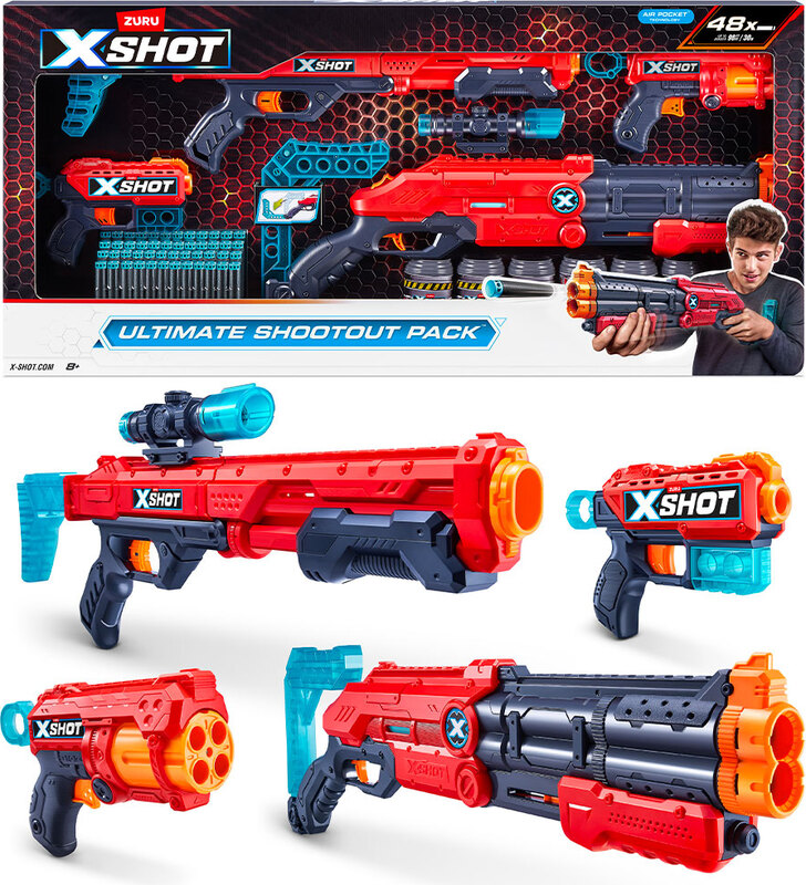 Készen áll minden csatára: az X-Shot Excel Ultimate Shootout Pack 4 lövőt tartalmaz, amelyek kielégítik az összes harci igényt, beleértve a lopakodást, a mesterlövész harcot és a közelharcot!